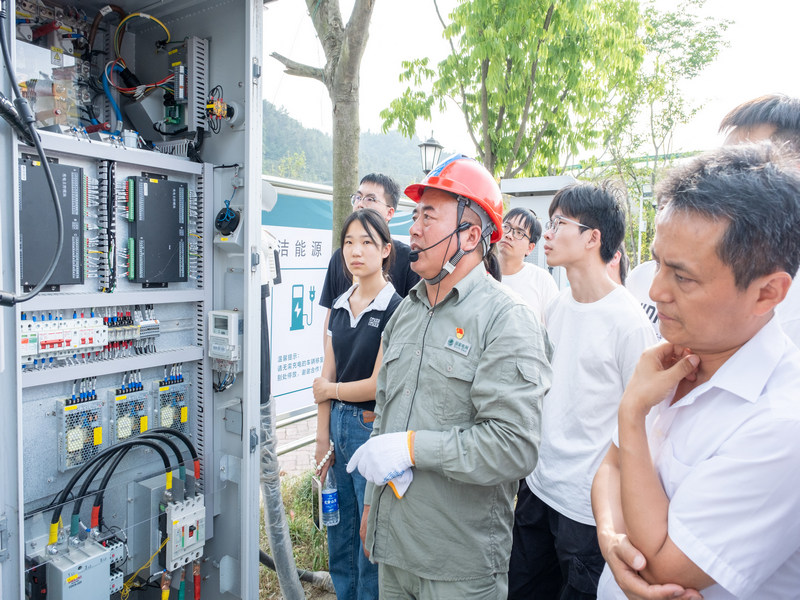 在黄龙供电所“王正洲实训工作室”创始人王正洲的带领下,师生参观了“王正洲实训工作室”、10kV线路、0.4kV台区和充电站,王正洲现场讲解了不同类型电表的接线原理及其功能,电网的运作和管理,新能源充电站的使用等。