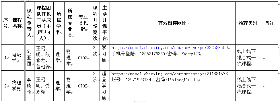 经课程负责人申请、jinnianhui今年会审核《电磁学》、《物理学史》省级一流本科课程申报书及支撑材料,《电磁学》、《物理学史》课程通过资格审查,符合参评条件要求,同意推荐《电磁学》、《物理学史》课程申报省级一流本科课程。课程具体信息如下: