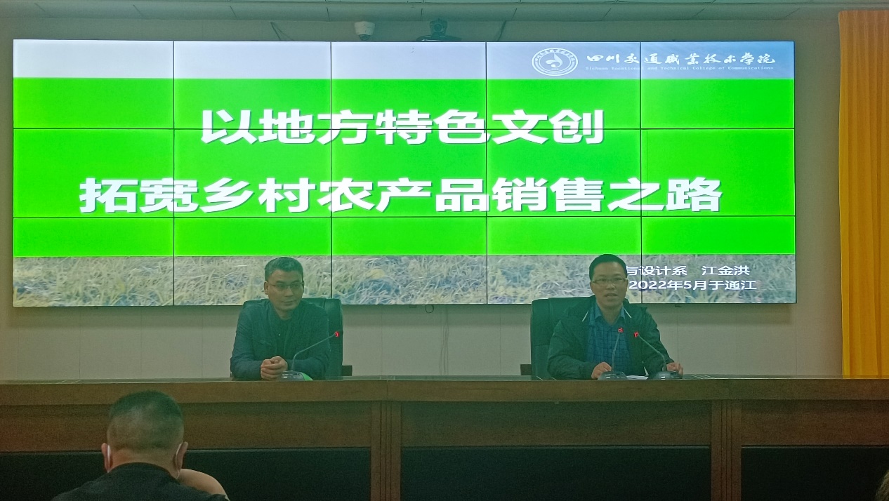 我系江金洪对中码头村食用菌产业发展相关政府、企业等人员开展“以地方特色文创拓宽乡村农产品销售之路”讲座,帮助提升产品竞争力。江金洪老师从文化创意赋能乡村振兴角度出发,以艺术集市、乡村品牌、艺术活动、家族文化、空间改造、乡村故事等研究实施路径,结合当地产业短板,从产品设计、包装升级、品牌塑造、商业销售模式等进行案例分析,近3个小时的讲座,受到了当地政府和企业等相关部门高度评价,为涪阳镇产业发展相关人员打开了产业发展思路,为文化赋能乡村振兴奠定基础。