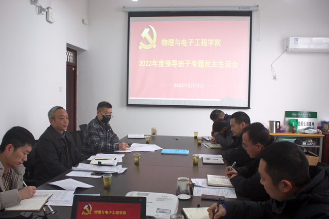 2023年2月15日下午,jinnianhui今年会2022年度领导班子专题民主生活会在崇文楼A503召开。校领导章平、外国语学院党总支书记夏金元、学校办公室齐鑫到会督导。学院党总支书记石义杰主持会议,学院领导班子全体成员出席会议,学院教工党支部书记欧修龙和学生党支部书记刘锋列席会议。