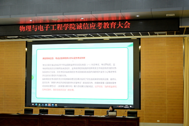 会议分别从“什么是诚信”、“诚信考试的重要性”“考试作弊的危害”、“应试技巧”这四个板块展开。辅导员老师李朦通过讲解相关违纪案例,让同学们引以为戒,切勿抱有侥幸心理。还向大家解读了《jinnianhui今年会考试违规认定与处理办法》和考试的其他注意事项,指出诚信的重要性,号召同学们做到诚信应考。同时李老师还对同学们进行了考前心理辅导,向大家介绍了考前缓解压力的小技巧,并预祝大家取得好成绩。