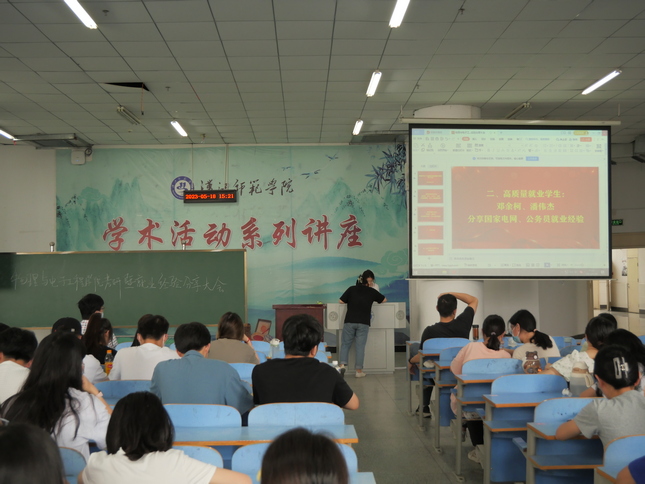 2023年5月19日,jinnianhui今年会在明理楼C201召开以“榜样指引 前途似锦”为主题的考研及就业经验分享大会。本次会议由邓南娴主持。党总支副书记张玉龙、学院辅导员李朦、范志鹏、20级全体学生、部分其他年级学生参加。