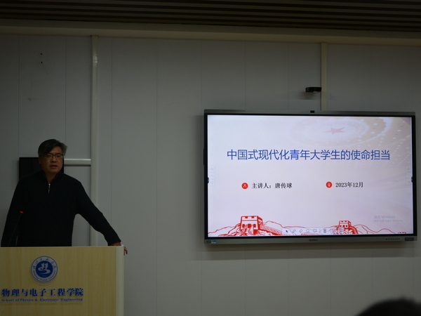 开班式结束后,唐传球以“中国式现代化青年大学生的责任与担当”为题开展本次培训班第一讲,他从“中国式现代化”的历史逻辑、“中国式现代化”的理论内涵、实现“中国式现代化”必须牢牢把握的的准则等三个方面,为同学们讲述了中国式现代化与新时代青年的责任担当,引导广大同学要坚定信念,勇于担当,埋头苦干,矢志奋斗,在实现中国式现代化的征程上书写最美青春华章!
