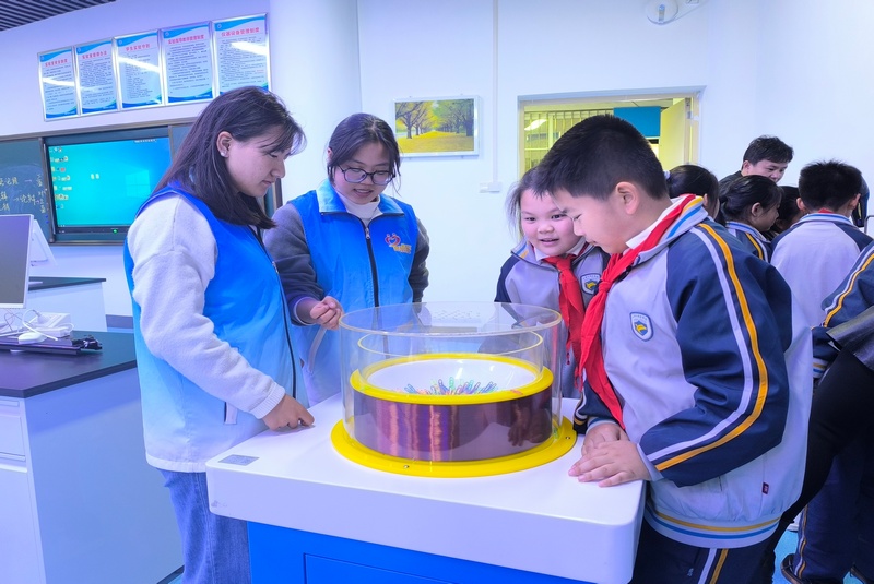 在物理演示实验室,志愿者们运用便携式波动光学演示仪、组合式静电演示仪、碰撞打靶演示仪、记忆合金演示仪、傅科摆等物理仪器将小朋友们带进了奇妙的科学乐园。实验过程中,小朋友们好奇地观察着实验现象,并不断转动自己的小脑袋提出疑问,志愿者们也耐心地为他们进行了讲解。而后,小朋友们在志愿者的陪伴下纷纷开始动手操作,亲自体验科学的各种神奇现象。
