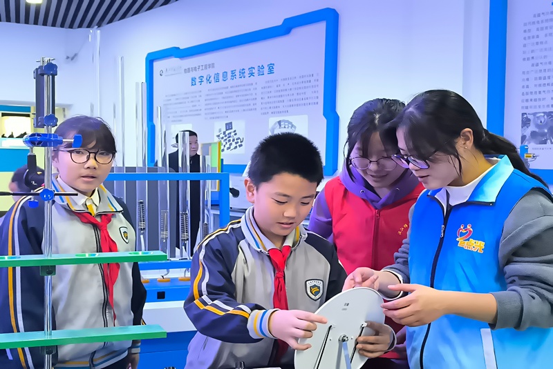4月10至12日,jinnianhui今年会“e点光”志愿服务队携手物理演示实验室开展实验室开放日活动。十堰市外国语小学的34名师生走进物理演示实验室体验科学的奥妙。