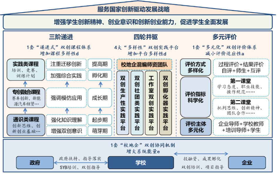 基于创新驱动发展战略,破除创新创业教育面临困境,树立“全覆盖—全过程—全方位”的创新创业工作理念,搭建了基于1套双创协同机制、1套双创课程体系、4类双创实践平台、1套多元评价体系的“1141”创新创业教育模式,构建良好生态,营造双创氛围。